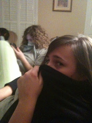 As we've been watching our movies, Cammie's been having "stomach troubles" i.e. she's been farting like a howitzer due to canned dog food. So as we sit in our respective seats, someone will catch a whiff and say something like, "Oh my gosh!" All those present automatically and immediately begin putting their shirt shield in place for any and all protection it may provide. We all continue to talk and watch our movie normally until the smell of death has left us. It's been happening often. Tonight was no exception. You will find several examples of our "masks" below. These make me laugh out loud every single time I see them. More good memories are made every day. Even the stinky ones.