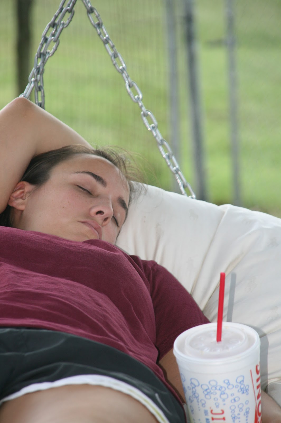 Carlie T became exhausted trying to finish her enormous Sonic and collapsed in the swing. |
